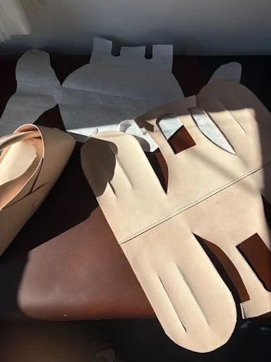 Through this experimentation, spending hours on end working with materials and using her techniques to craft her masterpieces, she is able to translate that imagination into reality. Though, let’s not forget about all of the in-between challenges a designer will inevitably face. For starters, material is limited, and working with leather comes with a learning curve. (Another thing I learned from Juliana was if you leave leather out in the sun, it will tan). Working with materials, you have to understand how to manage the amount of material and minimize any errors that would create excess waste. Juliana puts it that you need to “be proactive with your materials”, and because of this, it is the designer’s responsibility to put in the time and effort of planning before just going right into it. The overall process is as time-consuming as can be, and you need to have the space to lay your imagination in front of you.
